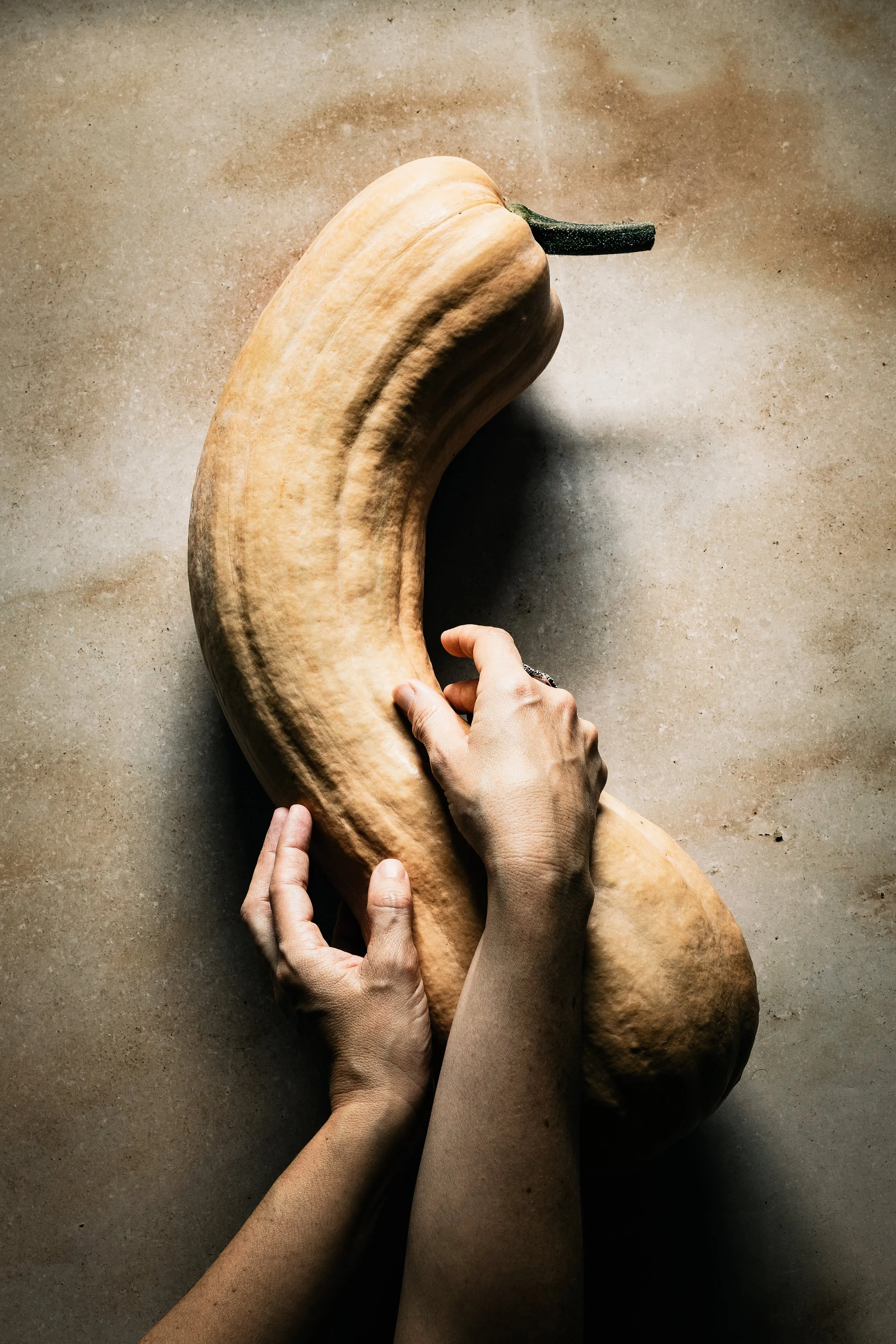 Person holding a large, curved, beige gourd or pumpkin on a stone surface.
